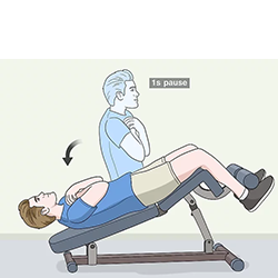قبل از اینکه به نیمکت برگردید، ۱ ثانیه مکث کنید. هنگامی که قفسه سینه شما روی باسن شما قرار گرفت، برای لحظه ای مکث کنید. در حالی که به آرامی پشت خود را به سمت نیمکت پایین می آورید، دم را شروع کنید. هنگامی که ستون فقرات شما 2 تا 5 اینچ (5.1 تا 12.7 سانتی متر) بالای سطح نیمکت معلق شد، توقف کنید. استنشاق هوا را تمام کنید و برای تکرار بعدی آماده شوید.